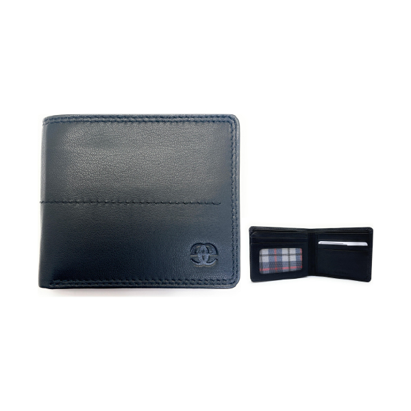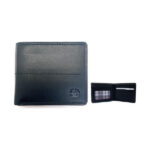 Cartera horizontal en color negro con acabado de piel y diseño elegante. Cuenta con ranuras para tarjetas, compartimento para billetes y ventana para identificación, ofreciendo estilo en un formato compacto. Ideal para uso diario o como regalo sofisticado.